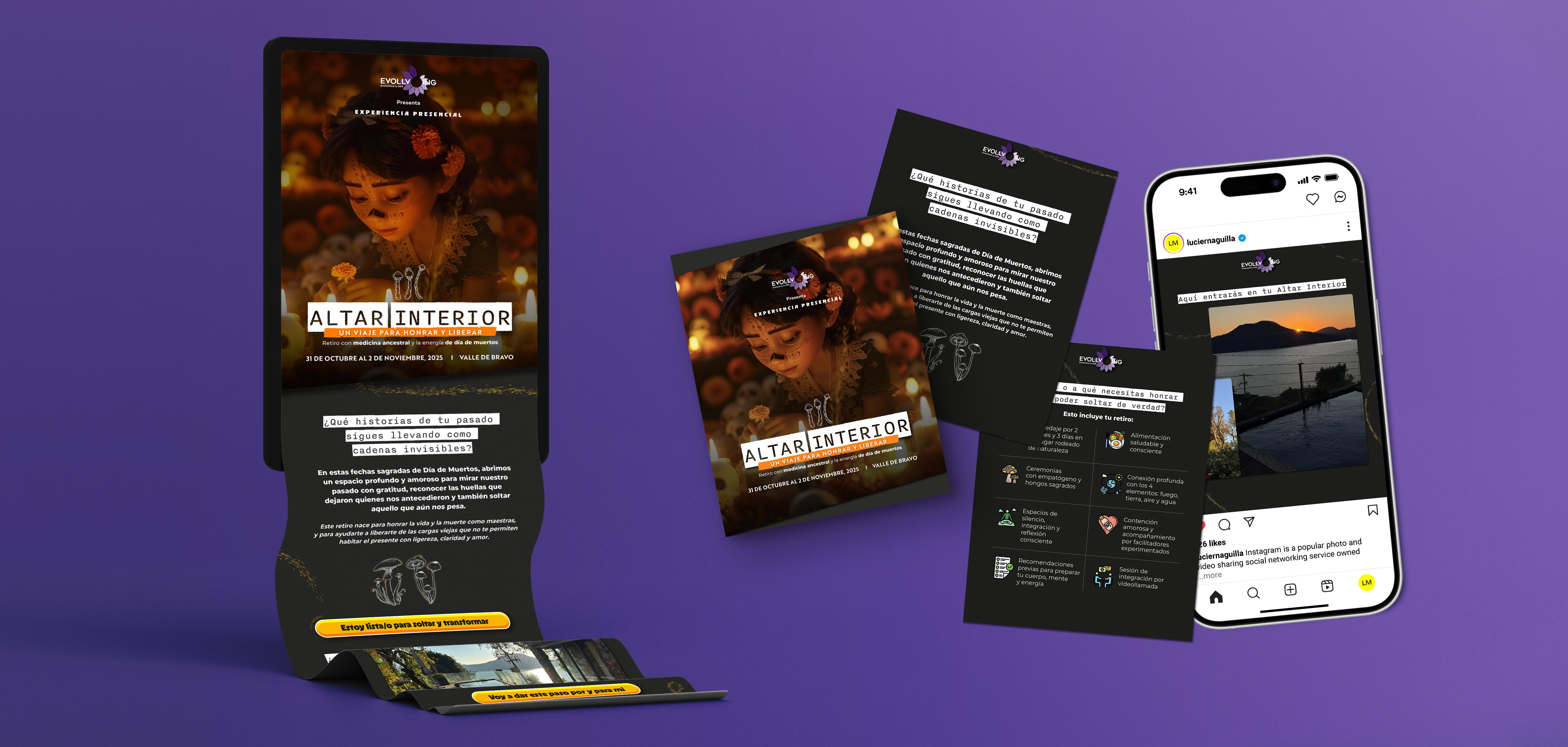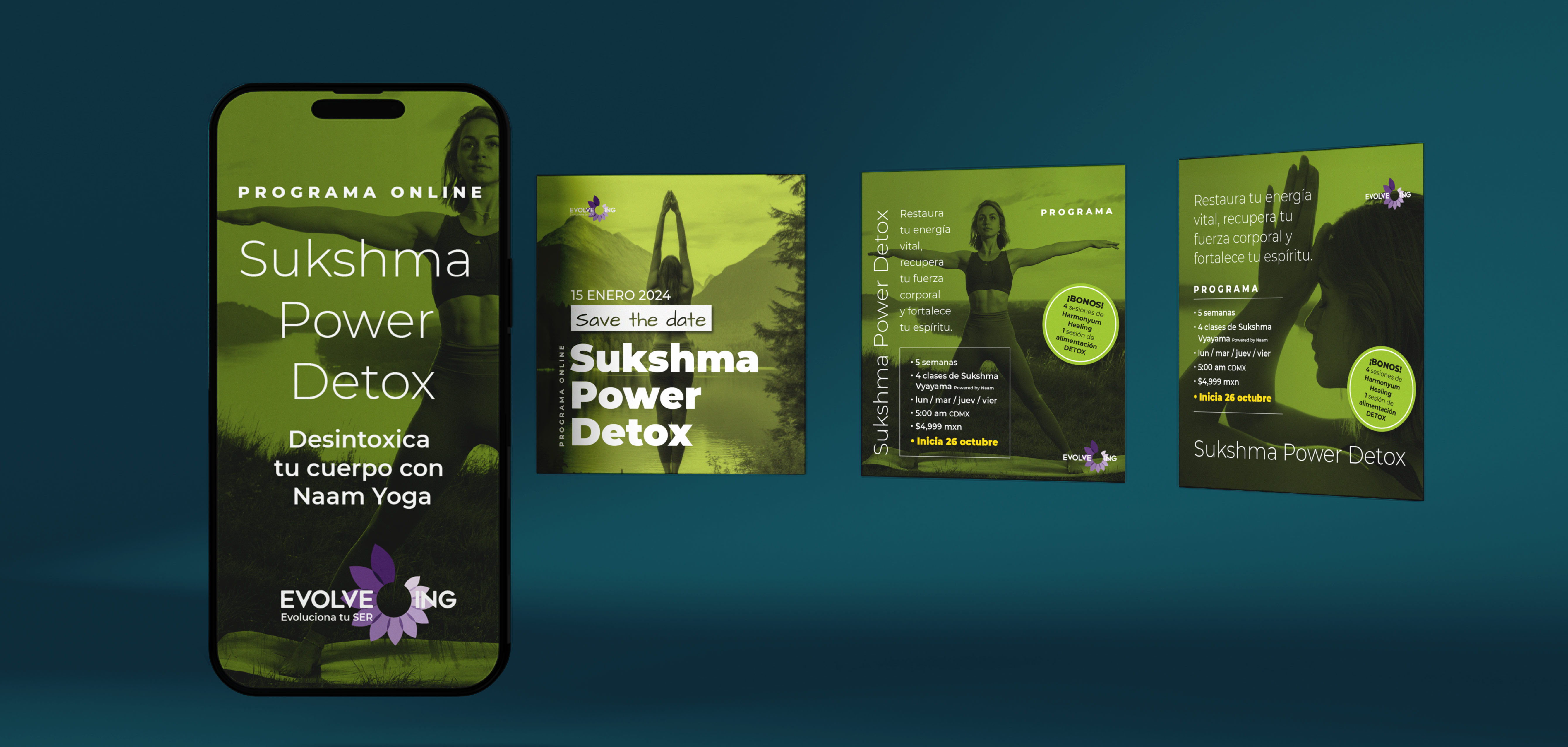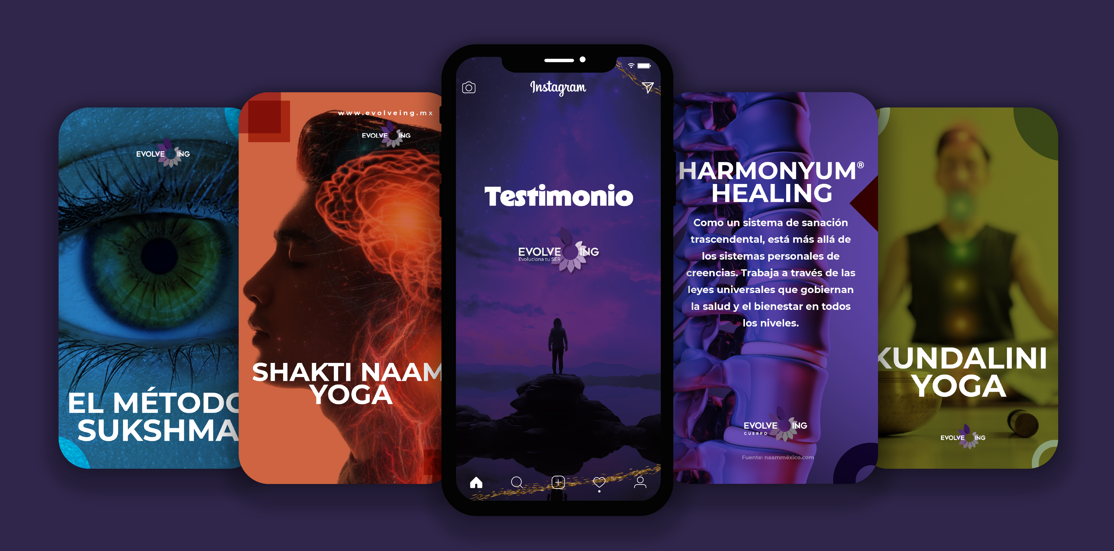 Desarrollamos la identidad completa de Evolveing, una marca dedicada al bienestar y la evolución personal a través de la medicina ancestral.