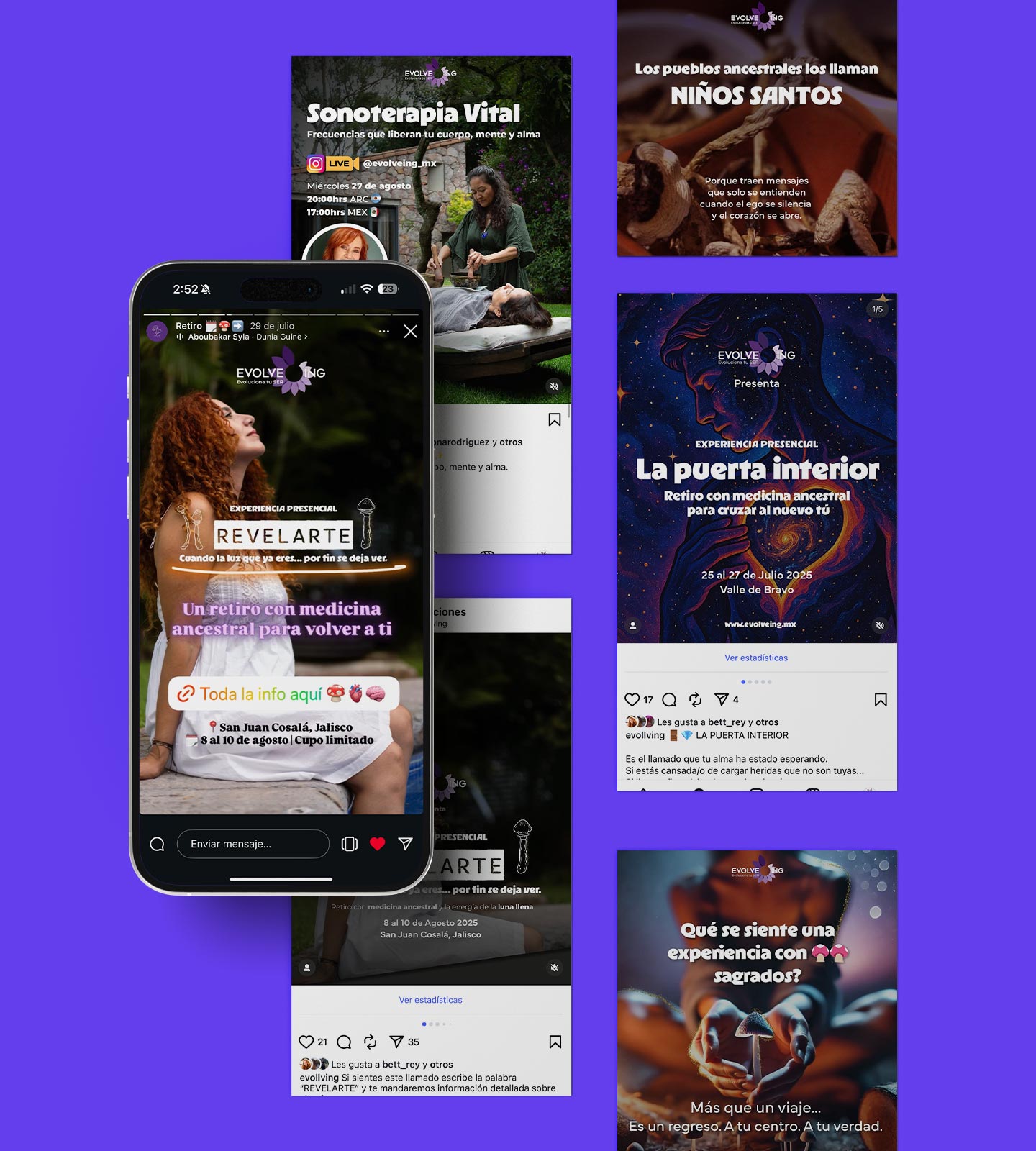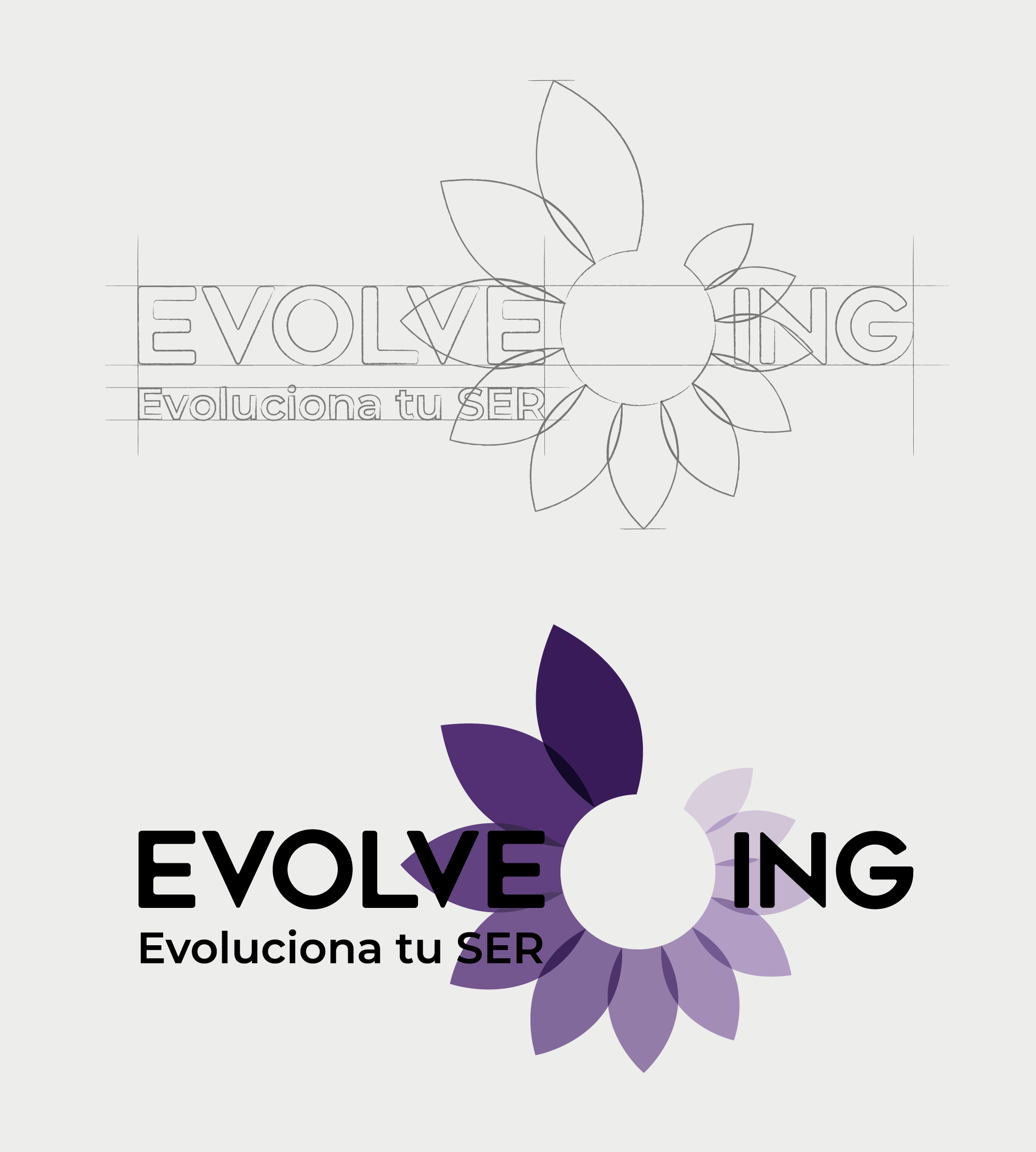 Desarrollamos la identidad completa de Evolveing, una marca dedicada al bienestar y la evolución personal a través de la medicina ancestral.
