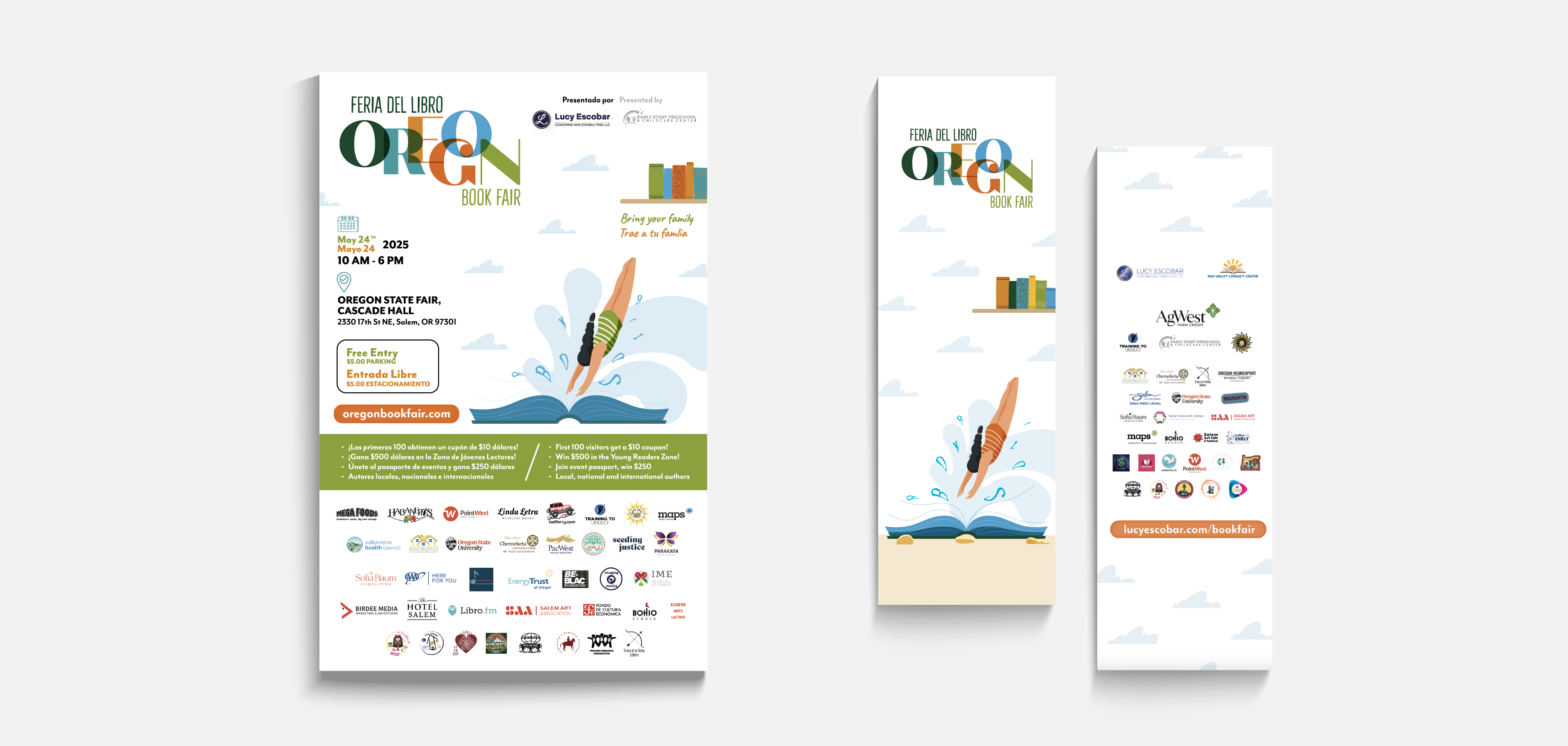 Desde la creación del logotipo hasta la presencia en el evento, Serpento desarrolló una estrategia integral para la Oregon Book Fair, dando vida a una identidad visual sólida y emocional. El proyecto abarcó el diseño completo de la marca, sitio web, redes sociales, materiales digitales e impresos, así como la coordinación creativa durante la feria.