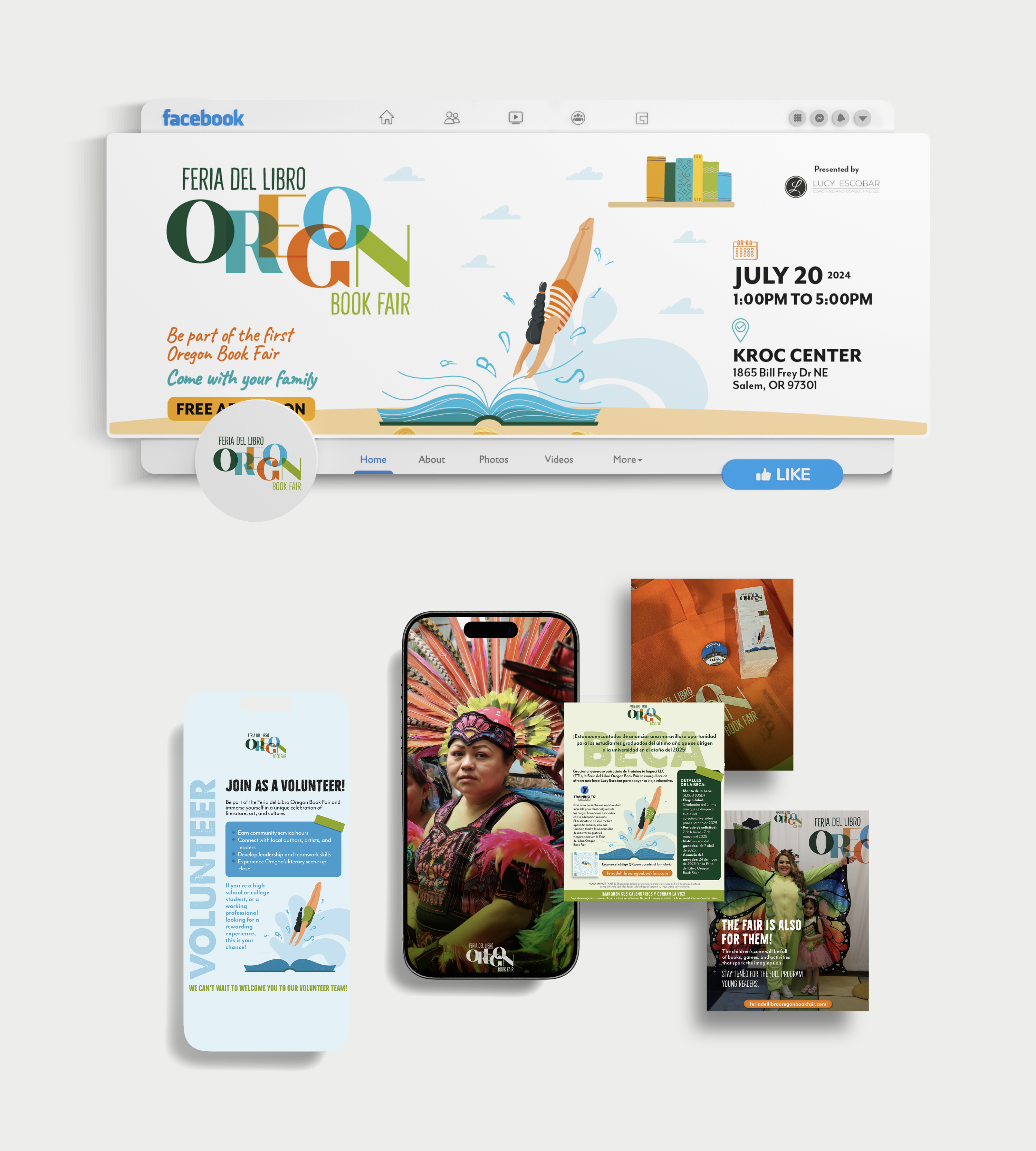 Desde la creación del logotipo hasta la presencia en el evento, Serpento desarrolló una estrategia integral para la Oregon Book Fair, dando vida a una identidad visual sólida y emocional. El proyecto abarcó el diseño completo de la marca, sitio web, redes sociales, materiales digitales e impresos, así como la coordinación creativa durante la feria.